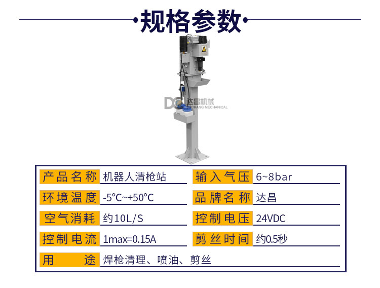 清槍器專為配有自動焊接系統的機器人焊槍及自動焊槍設計清槍站由機器人控制該設備的運行,設備也會將相應的反饋信號提供給機器人。清檢站具有清槍、噴油、剪絲的功能。